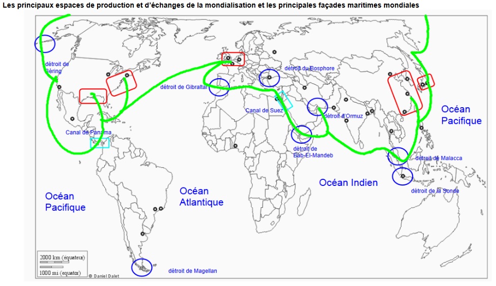 L'accroissement du trafic maritime international - près de 90 % des échanges de marchandises - a considérablement amplifié leur rôle géopolitique. C'est d'autant plus vrai avec " la montée des impérialismes maritimes, notamment chinois". Pékin investit depuis longtemps dans des États contrôlant les détroits ou canaux (tel Panama.