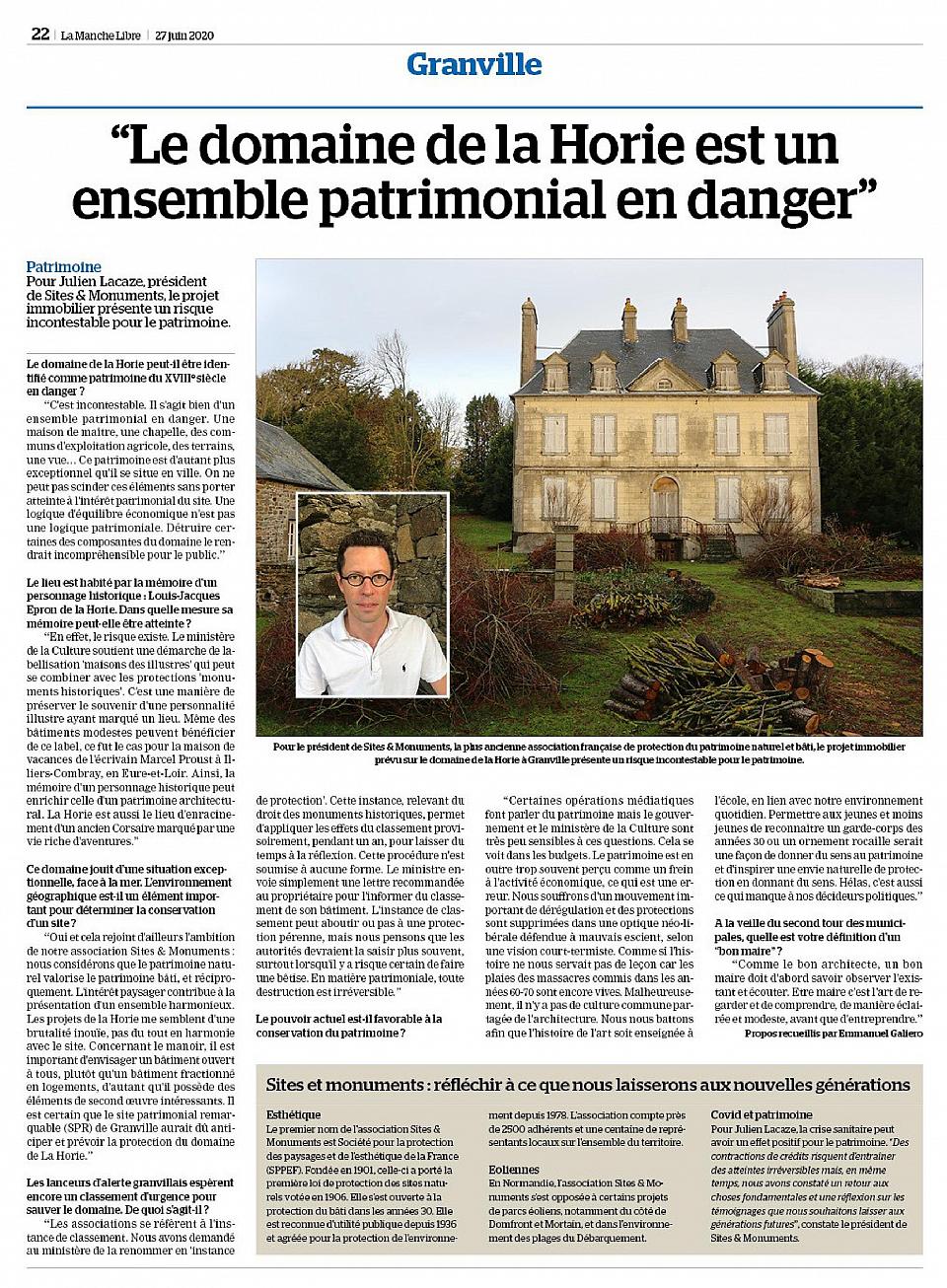La Manche Libre du 27 juin 2020 "Le domaine de La Horie est un ensemble patrimonial en danger