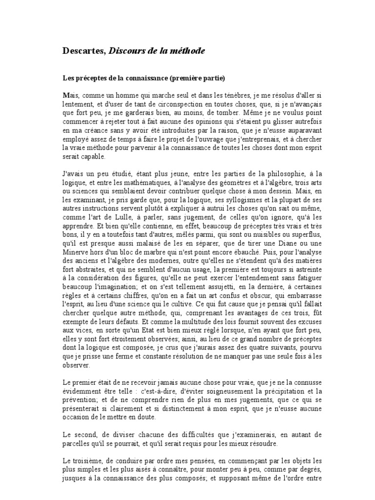 Le Discours de la méthode est à la fois un témoignage et une promesse.. Descartes y raconte comment il a trouvé « la vraie méthode pour parvenir à la connaissance de toutes les choses dont (mon) esprit serait capable », et il s'engage à en faire bon usage pour cultiver sa raison et progresser dans la vérité. Premier texte publié du philosophe, le discours, dont le titre complet.