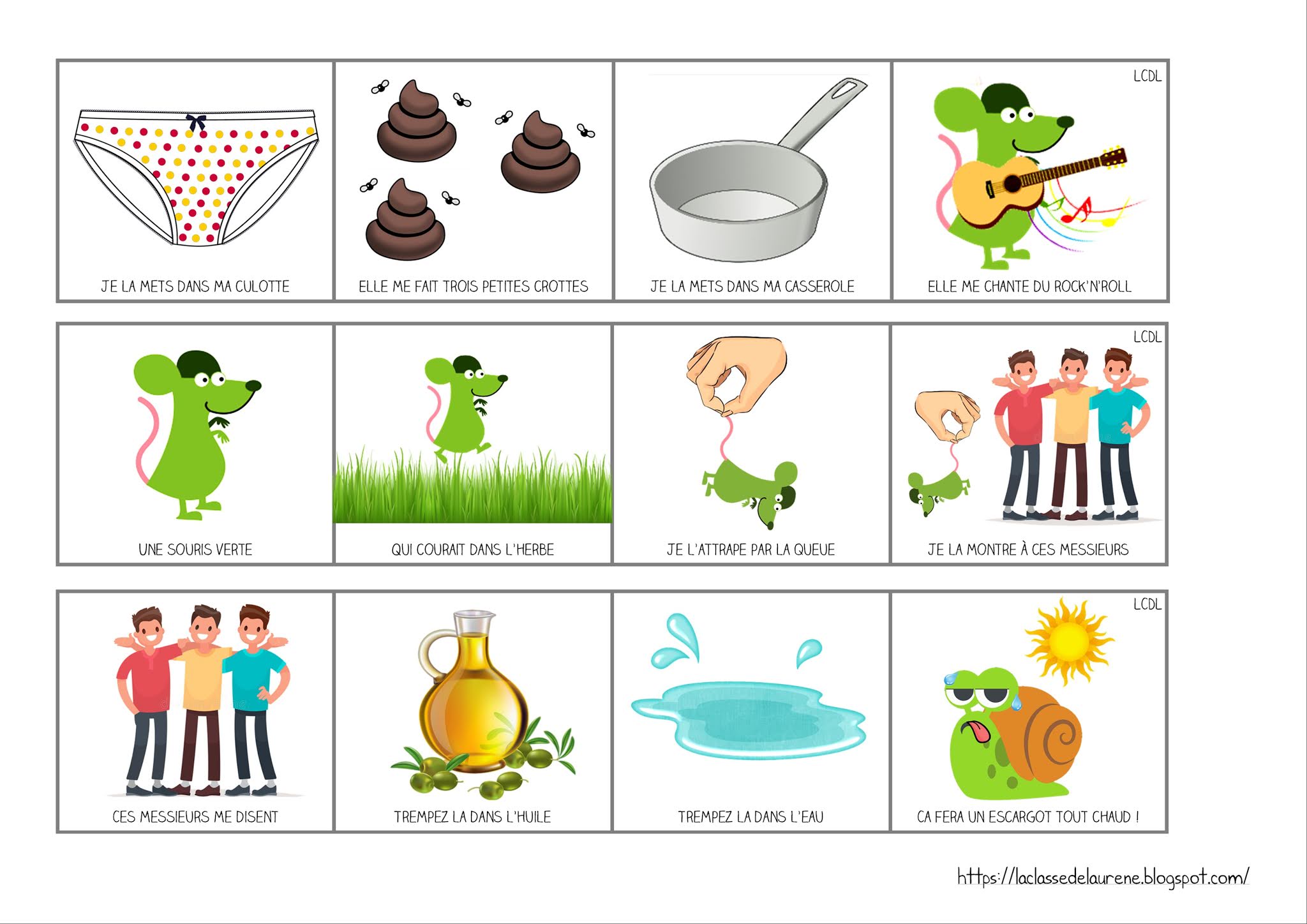 Une souris verte. Qui courait dans l'herbe. Je l'attrape par la queue. Je la montre à ces messieurs.. Trempez-la dans l'eau. Ça fera un escargot. Tout chaud !" Je la mets dans un tiroir. Elle me dit : "Il fait trop noir !" Je la mets dans mon chapeau. Elle me dit : "Il fait trop chaud !" Je la mets dans ma culotte. Elle me fait trois.