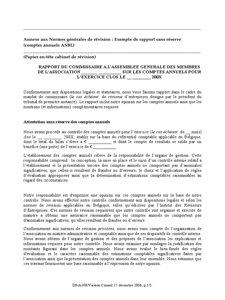 Exemple de Rapport Du Commissaire Annuels Asbl) Contrôle interne Droit statutaire